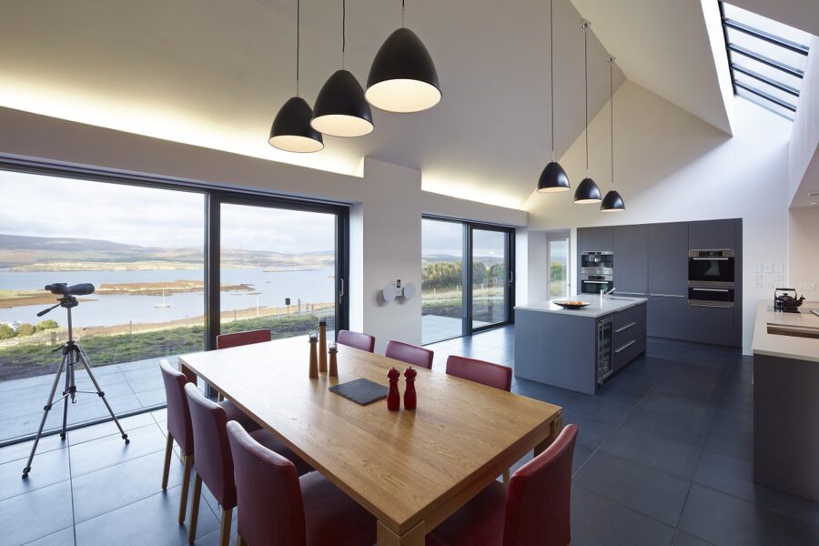 The view through the frameless glazed gable dominates the main living room as you descend the stairway.